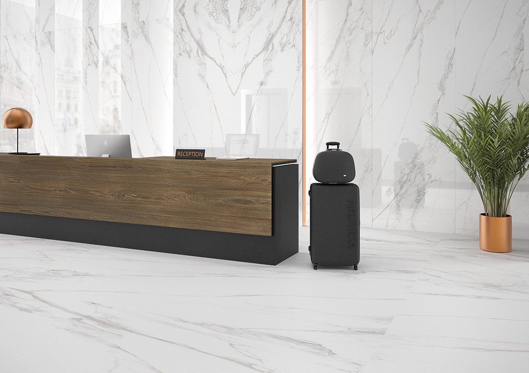 The unalterable porcelain slabs mimic marble in their aesthetic quality but are resistant to stains and extreme temperatures. This makes it ideal for kitchen and bathroom countertops, floor and wall coverings, and exterior building/residential facades.